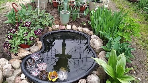 Обзор клумбы вокруг пластмассового пруда.