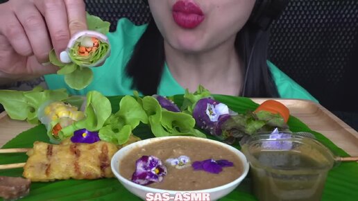 ASMR КАК КРАСОТА, ЧТОБЫ ЕСТЬ САЛАТНЫЕ РУЛЕТЫ + КУРИЦА САТАЙ (ХРУСТЯЩИЕ ЗВУКИ ПОЕДАНИЯ) NO TALKING | SAS-АСМР