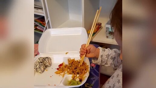 Олеся пробует есть палочками.Почти получается)
