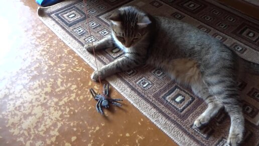 Мурка играет с пауком. А с ниточкой-то интересней
