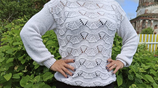 Женский ажурный джемпер спицами. Вяжем снизу вверх. Спущенное плечо. Размер 44-48.