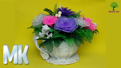 Розы из капрона в плетеной корзинке-кружке Легко и просто Подробный мастер класс \Master diy