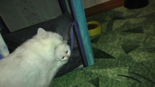 Маленький котенок хочет вылезти из домика, а мамка не дает