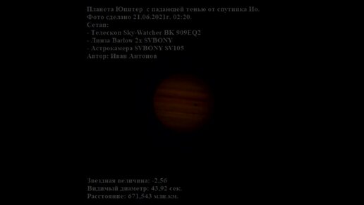 Тень Ио на Юпитере. Тест сетапа : Sky-Watcher BK 909EQ2, SVBONY Lens Barlow 2x, SVBONY SV105.