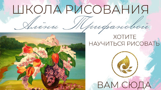 Урок живописи гуашью Сирень и тюльпаны речной пейзаж