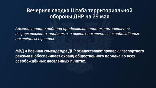 Вечерняя сводка штаба территориальной обороны ДНР на 29 мая 2022 года
