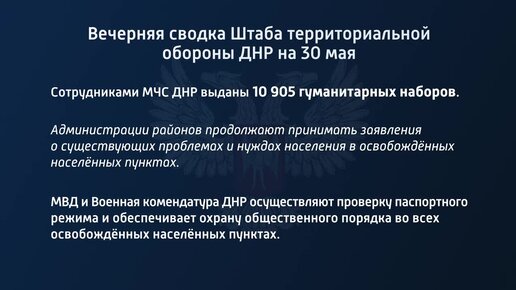 Вечерняя сводка штаба территориальной обороны ДНР на 30 мая 2022 года