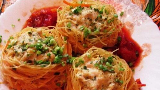 Обожаю этот рецепт. Гнезда из макарон с фаршем!