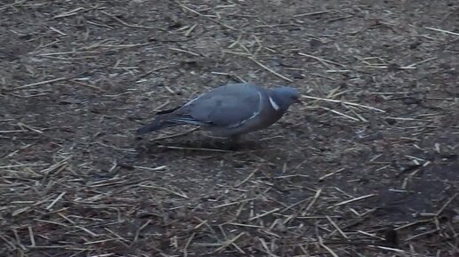 Вяхирь прогуливается по огороду в поиска зерна (в качестве мульчи используется пшеничная солома и там есть пшеничка)