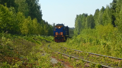 Пригородный поезд в лесной глуши- маневровый тепловоз и пара вагончиков. Пермский край