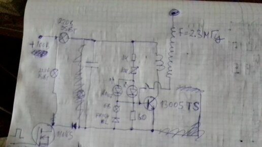 Тесла качер 2.3 МГц на 13005. Модуляция 2 кГц. Питание U=90 В. Коронный разряд. Осциллограмма. Схема