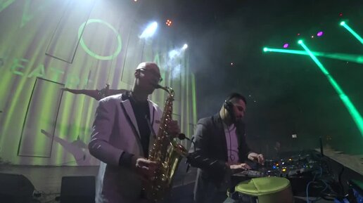 Современный ночной клуб - Саксофонист и Диджей и Акробатика на лентах, красивая девушка выполняет трюки на сцене