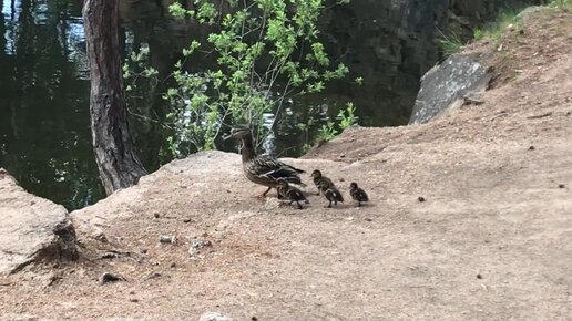 Смешные маленькие утята учатся переходить дорогу в лесу под присмотром мамы-утки