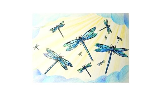 Стрекозы в небе - рисунок акварелью, линером и цветными карандашами.