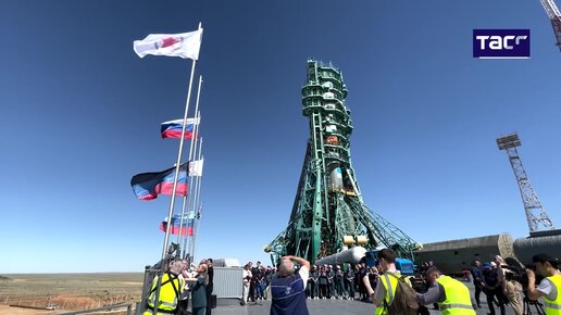 Дети Донбасса и специалисты Роскосмоса перед стартом "Союза" подняли флаги ДНР и ЛНР