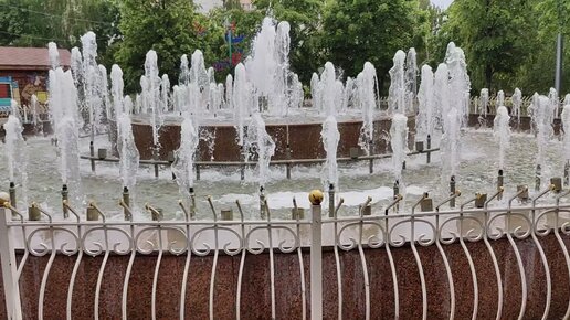 Обзор круглого фонтана в Люблинском сквере после грозы и шум воды