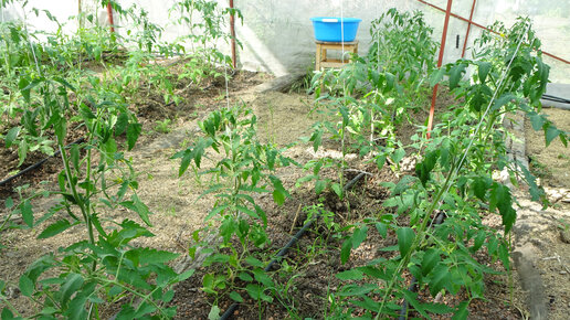 Первая формировка томатов. Укрытый грунт в начале июня. Огород.
