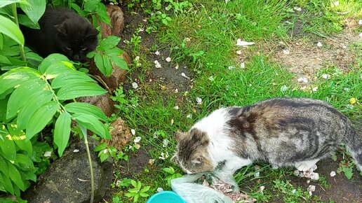 Кот - жадина, не дал поесть другому коту. Тот обиделся и ушёл.