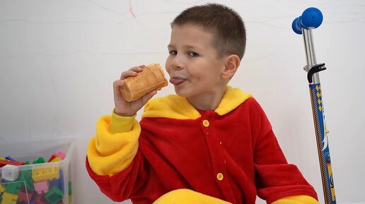 Ребенок ест шоколадный пончик и вкусное мороженое с цветными конфетами
