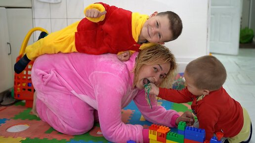 Мама ползает на четвереньках а дети катаются верхом и кормят ее цветными макаронами