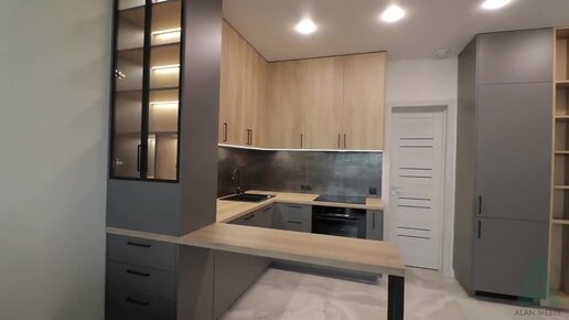Современная угловая кухня с барной стойкой