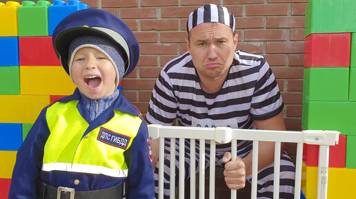 Малыш полицейский на машинке ловит нарушителя и синий трактор вытаскивает из грязи