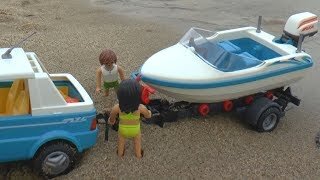 Сеня играет в машинки игрушки и перевозит на трейлере катер к морю