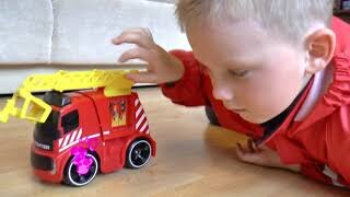 Сеня играет в пожарного и понарошку тушит колесо машинки игрушки