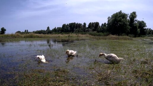 Ручные гусята впервые пасутся на траве и купаются на воде с уходящих разливов) Пугливых уток пасти пока не решились.