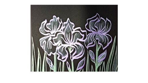 Стилизованные цветы ириса нарисованные маркерами металлик на черной бумаге.