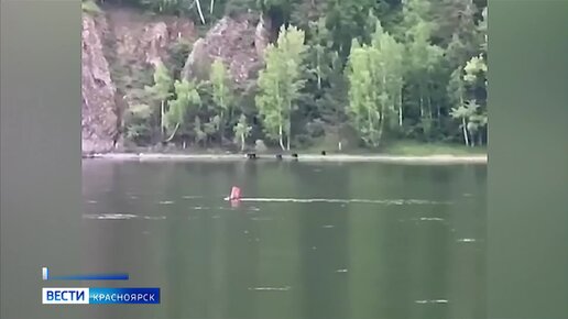 В окрестностях Дивногорска на берег Енисея вышло медвежье семейство