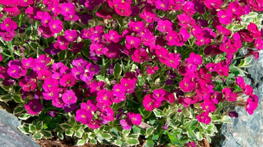 Цветок обриета который можно посеять в июне сразу в грунт, образует яркий обильноцветущий коврик без ухода
