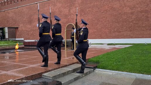 Смена караула. Пост Почётного караула у Вечного огня на Могиле Неизвестного Солдата у стен Московского Кремля.