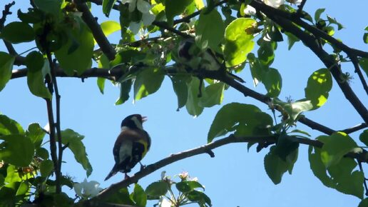 Щеглы общипывают дикую яблоню