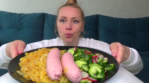 Капуста тушеная с сосисками, салат из огурцов и редиски с зеленым луком. Еда.