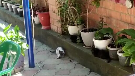 Кот Барсик играет с игрушкой, а кошечки с верху, наблюдают за ним и не выдерживают, кидаются на кота.