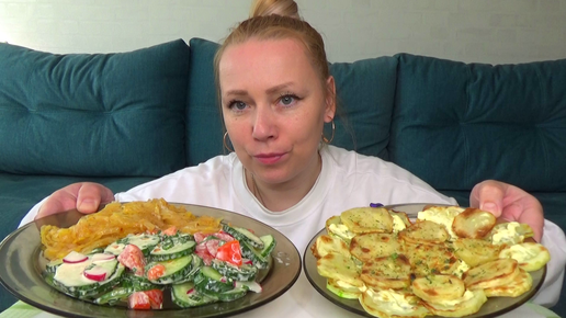 Кабачки жареные в муке и с чесноком. Салат овощной летний. Еда на камеру.