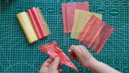 Нарезала квадратики из пакетов и сделала из них кулёчки - красивый декор быстро и просто