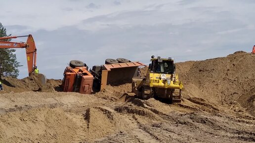 Перевернулся самосвал на стройке дороги