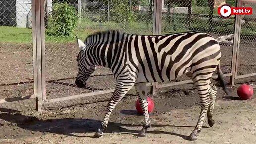 Зебра Зара впервые играет с мячами в челябинском зоопарке