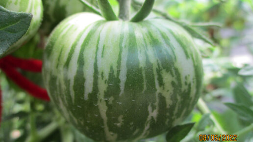 Экзотический томат Люсинда - морковные листья и плоды тигровой окраски. Обзор листьев, зеленых и спелых плодов.