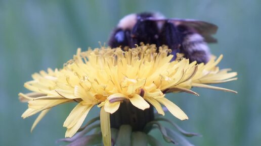 Шмель на одуванчике крупным планом