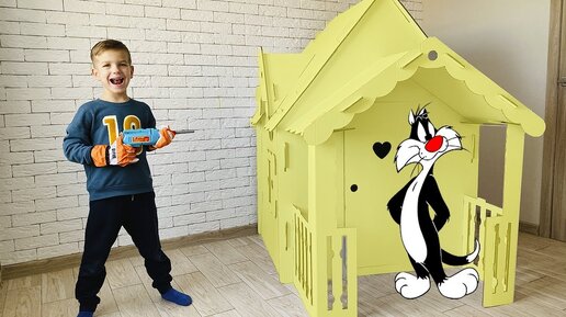 Марк сделал огромный домик из картона для кота. Видео для детей.
