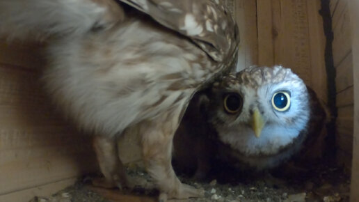 Домовый сыч Майка кормит птенцов. Малыши уже начинают рамсить.