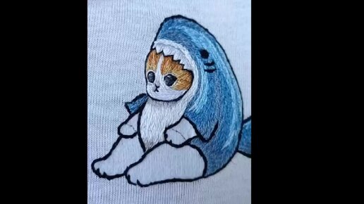 кот в костюме акулы ( вышивка гладью на одежде )