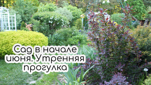 Сад в начале июня. Утренняя прогулка. Спиреи, сирень, цветёт роза Фламентанц первого года посадки