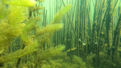Подводный мир среди камышей в 4к 60fps. Подводные съемки растительности и обитателей водоема.