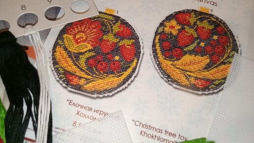 ГОТОВАЯ РАБОТА ВЫШИВКА КРЕСТИКОМ. ХОХЛОМА ШАРЫ НА ПЛАСТИКЕ.