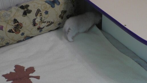 Маленький котенок изучает кровать