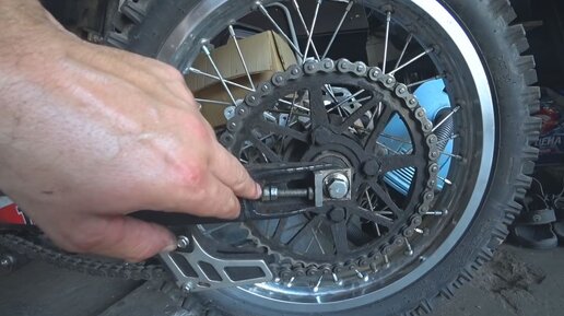 Растянулась цепь на мотоцикле, показываю как легко её натянуть.